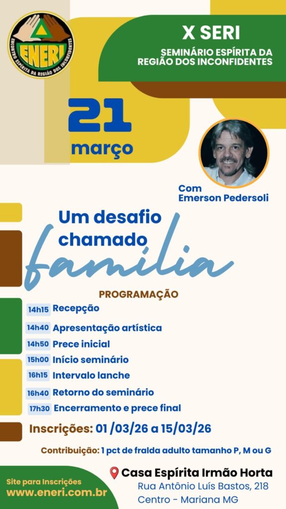 ENERI – Encontro Espírita da Região dos Inconfidentes 2025, um evento espírita inspirador a ser realizado nos dias 27 e 28 de setembro na cidade de Mariana-MG. Junte-se a nós nessa jornada de conhecimento, reflexão e fé na vida!