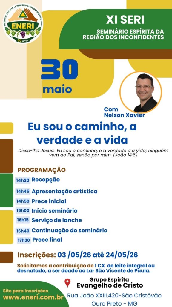 Venha participar do X Seminário Espírita da Região dos Inconfidentes! Este evento proporcionará uma reflexão sobre o papel do Espiritismo e da Casa Espírita no acolhimento e na transformação espiritual dos seus participantes.